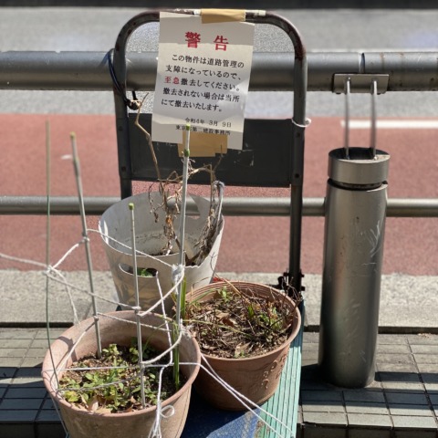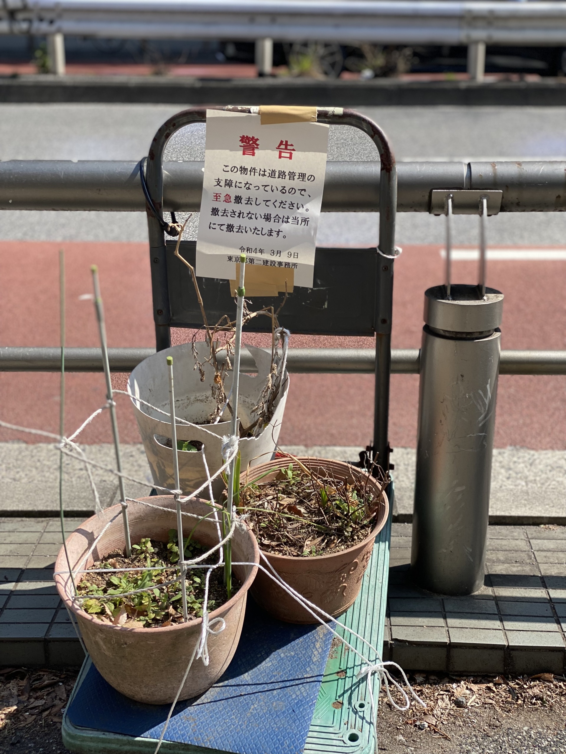 以前は「不法投棄物」って張り紙も貼られていましたが、今日も確認したら、その紙は剥がされて、物だけが置いてありました。植物も育ててらっしゃる。