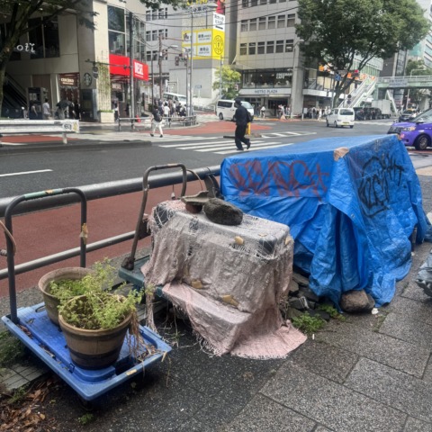 と思いつつ眺めていたら、なんとブルーシートやら植物たちの置き場所が拡大されていてびっくり。最初は、超有名ブランド「V」の前だけでしたが、今日は隣の超有名ブランドの「G」にまで広がっていました。